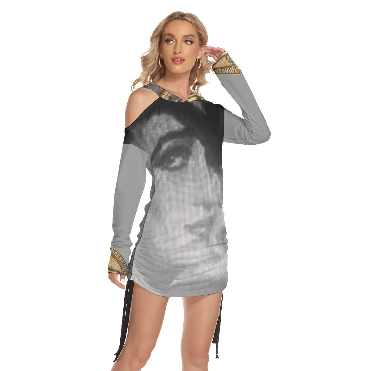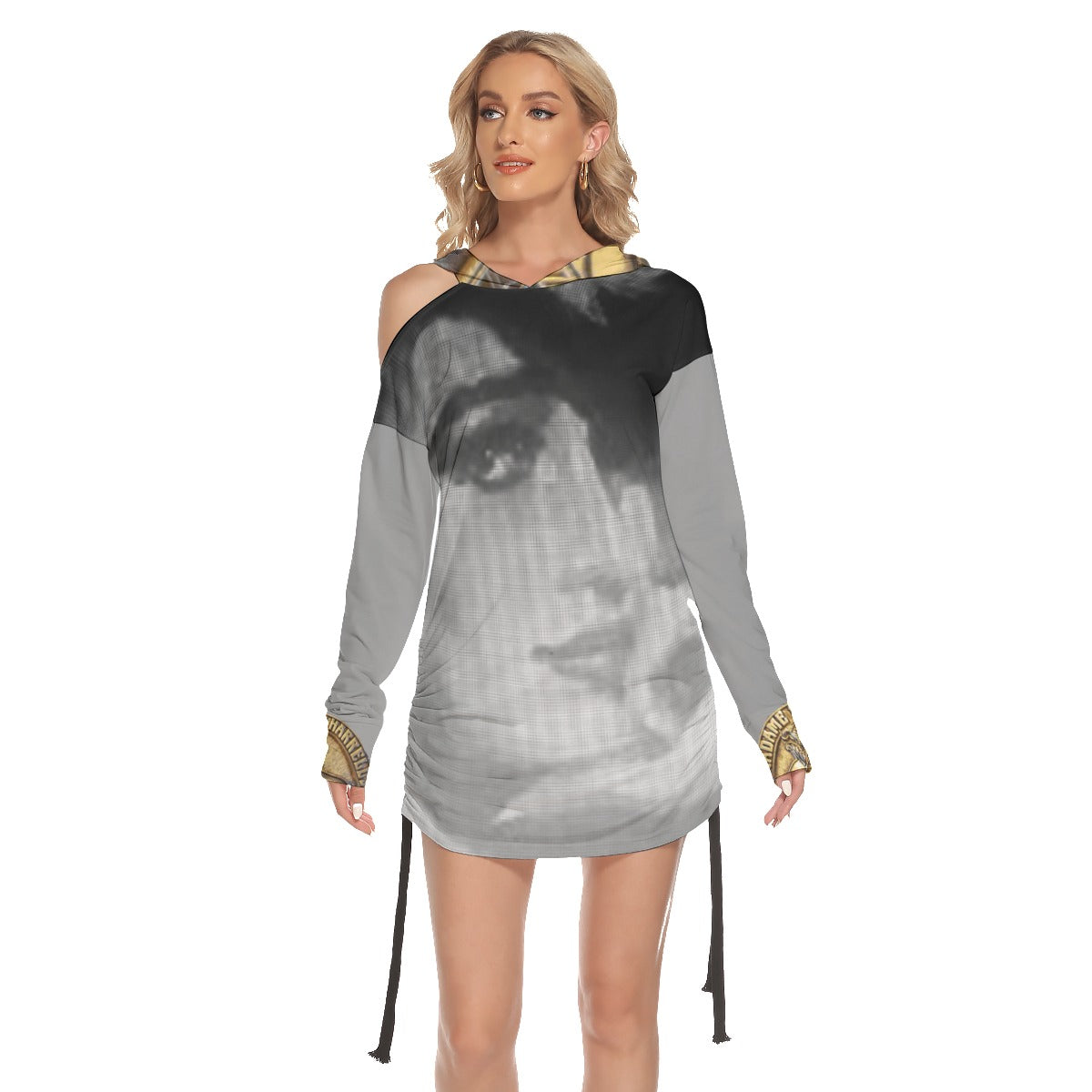 The Cottontail Ranch "Cold Shoulder" Hoodie Dress bares one shoulder, with sleeves past the wrists. Shirring at the sides makes the dress length adjustable. You decide if it looks best longer, shorter, or just on the floor!