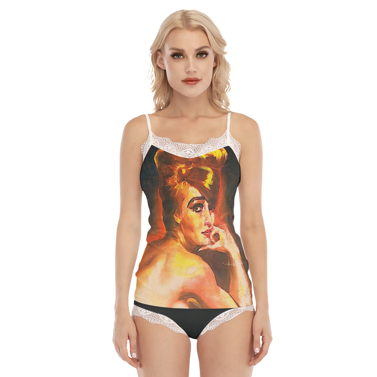 The portrait of the legendary Sunny adorns the front of the cami top of this sexy two-piece lingerie pajama suit. White lace edges and suspender top straps with color-matched panty. High resolution print of a copyrighted Jonathan Warren photo of the actual painting.