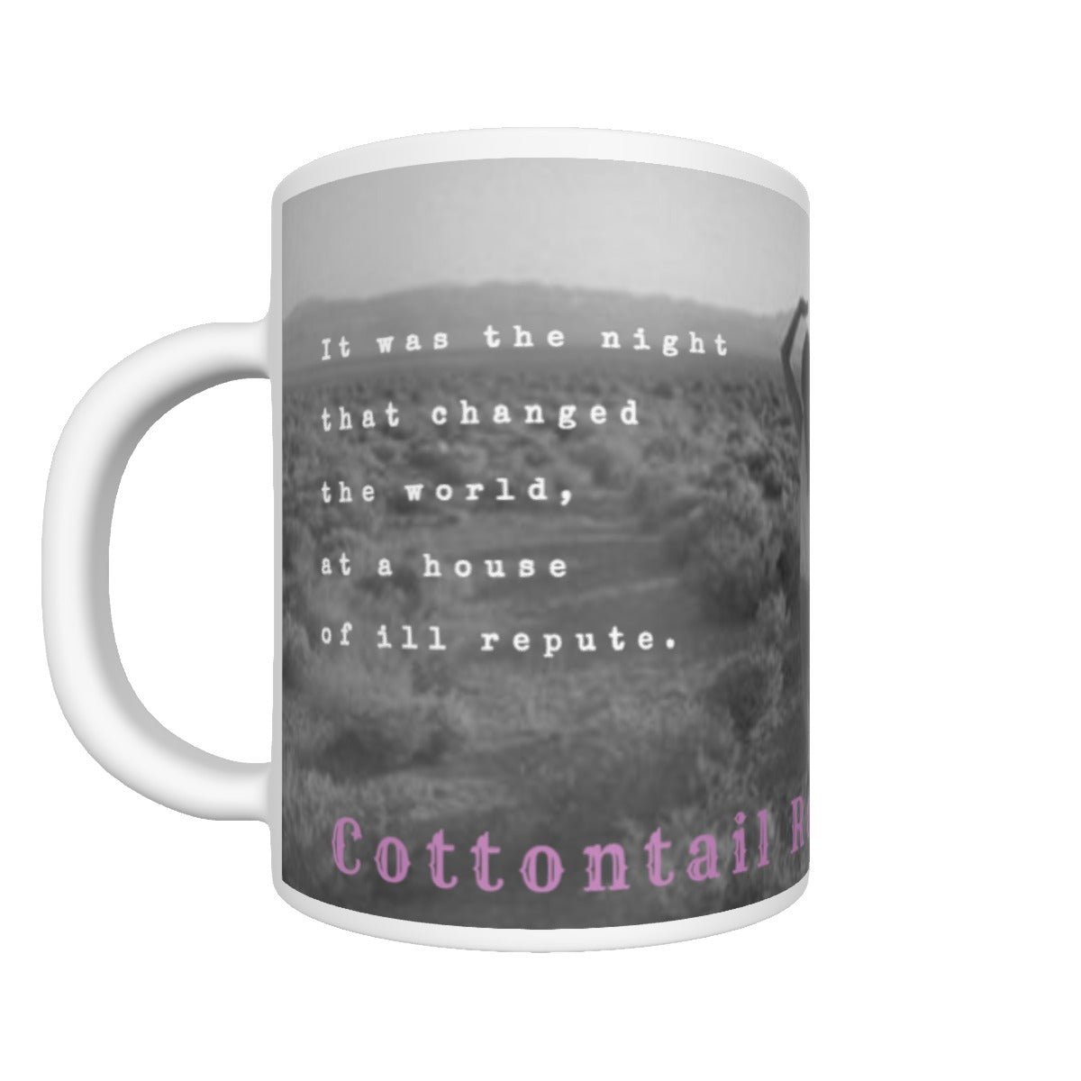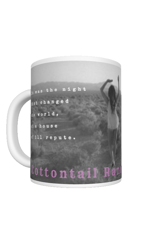 - Wrap-around print of vintage 1967 Cottontail Ranch girls on the Ranch property, with orginal Cottontail Ranch brass belt buckle in corner and QR code linking to the story of the Ranch. Large "Cottontail Ranch" old west font logo. Reads: "It was the night that changed the world, at a house
