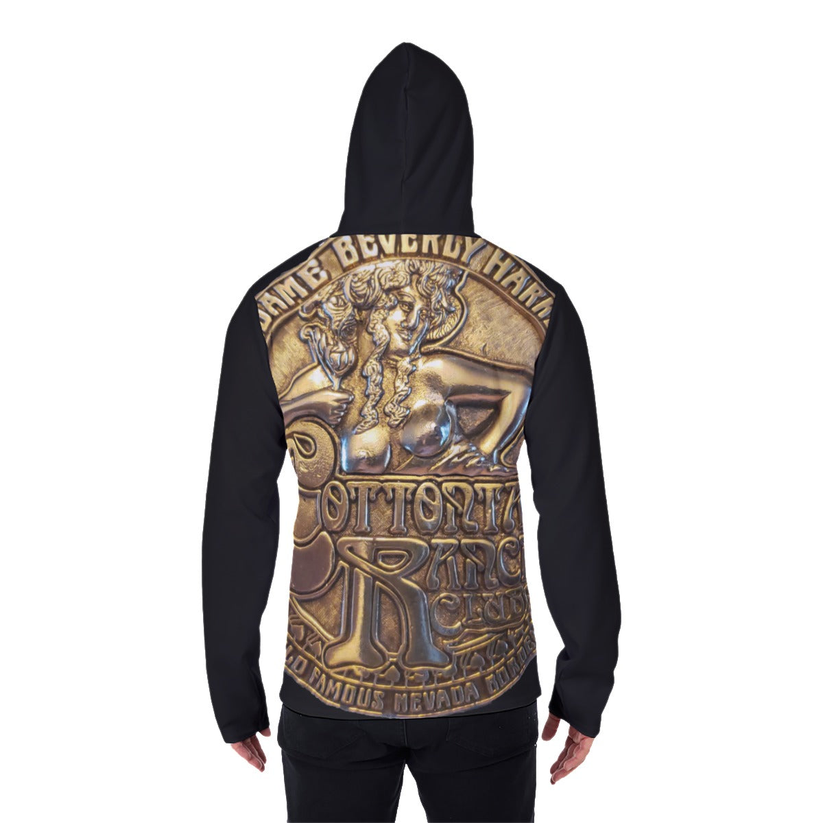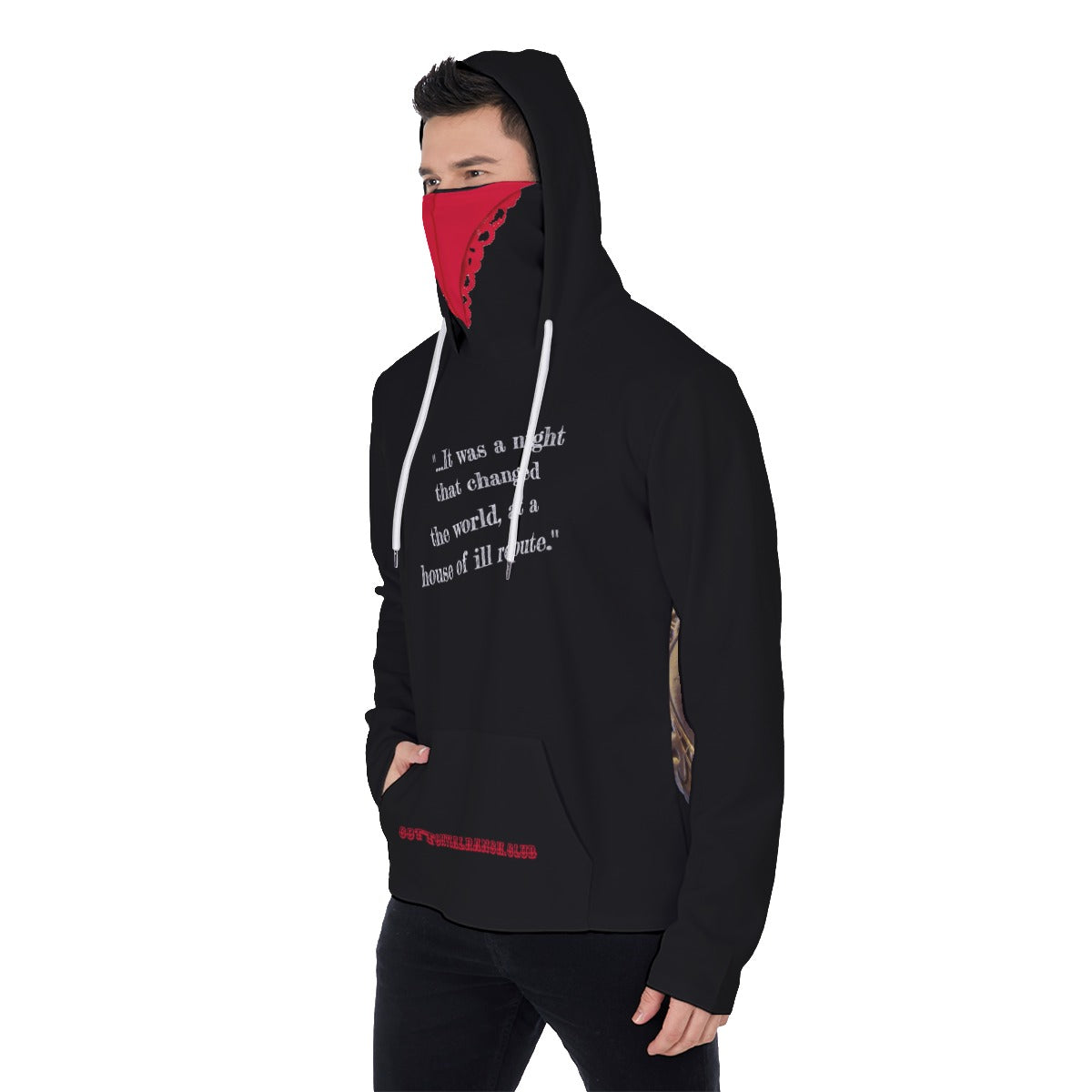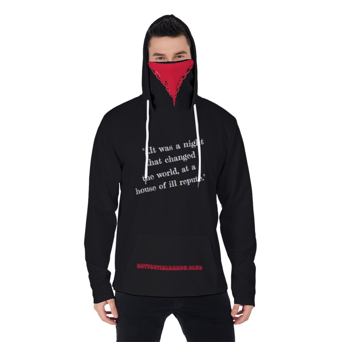 A fleece hoodie with built in facemask decorated with a print of red panties. Front caption in rough with typeface reads, "...It was a night that changed the world, at a house of ill repute."