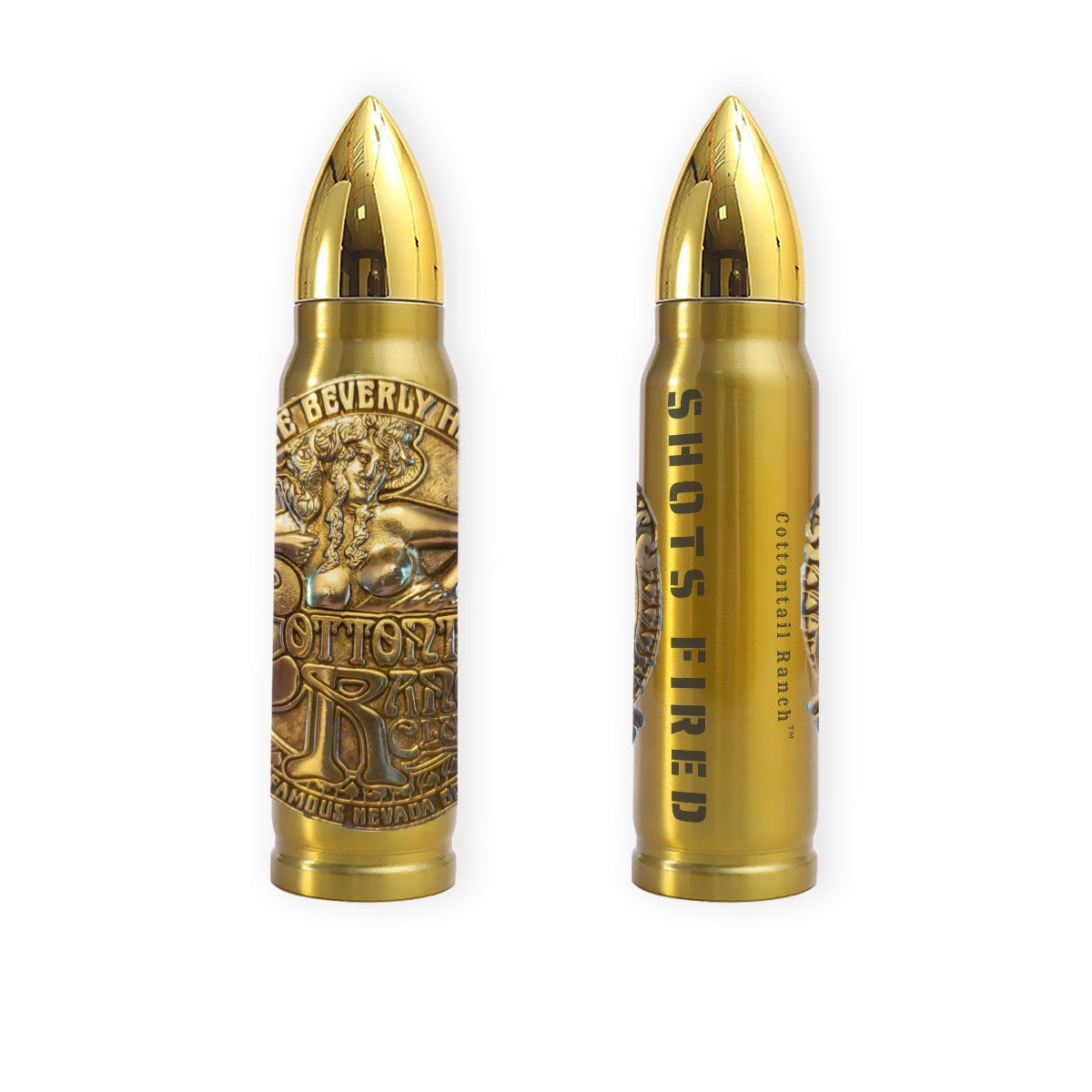 Bullet-shaped, stainless steel insulated flask. Keep drinks hot or cold for hours. "Shots Fired" printed in militar style down the shell casing side, next to high resolution photo print of the original brass belt buckle of the Cottontial Ranch. Old west style font reads "Cottontail Ranch."